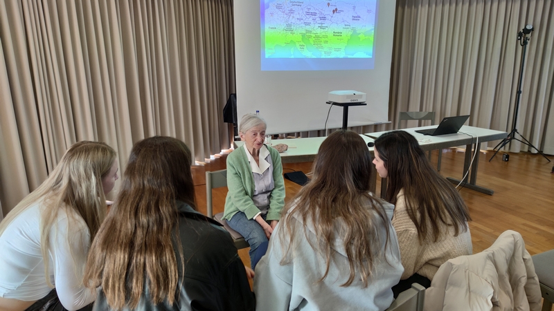 Henriette Kretz im Gespräch mit Schülerinnen des Sebastian-Münster-Gymnasiums