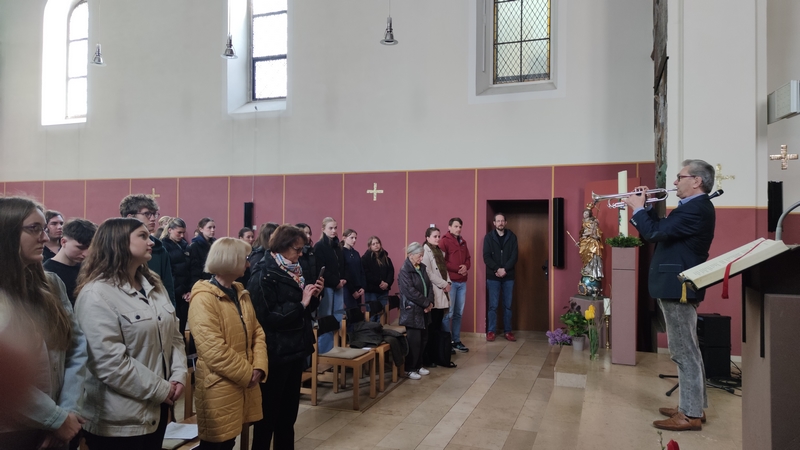Mieczyslaw Grochowski begrüßt die Schüler*innen mit einem Lied auf seiner Trompete.